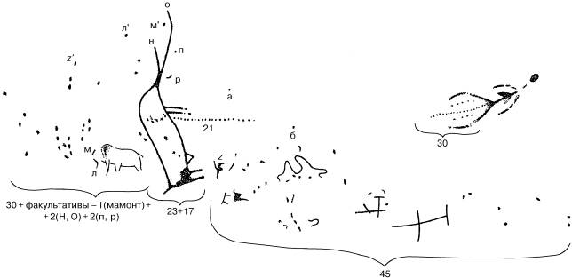 3. Запись синодического лунного месяца, начало которого сближено с фигурой “Черного (лунная символика?) мамонта”, а финал – с пастью “Красного (лунно-солнечная символика?) дракона” (см. рис. 2–30); к этому же тексту относятся 2 знака – челюсти дракона (см. рис. 2 литеры н и о) и сама фигура “Черного мамонта”, которую следует, при определенных условиях, воспринимать как счетную единицу (факультатив); вместе эти 3 знака образуютфакультативную часть записи лунного цикла, которая использовалась лишь при счислении 13-го (дополнительного!) месяца в третьем лунном году;
