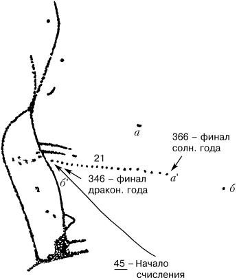 Такая расшифровка значимости пунктирной линии пятен, совмещенной на одном конце с брюхом дракона, позволила должным образом оценить знаки, связанные с туловищем его, и, в конечном счете, раскрыть семантику всей этой странной по очертаниям фигуры. В целом непосредственно с драконом оказались связанными 17 знаков – 11 пятен (9 – в пределах туловища, что установлено при сравнении нескольких опубликованных изображений) и 6 структурных частей туловища (прямые линии ног, фаллос и хвост). Число 17 – высоко значимо в календаристике и астрономии. Оно отражает или период наблюдения Луны от первого серпа до суток проявления признака ущерба (в пифагореизме – “печать смерти”), или половину эпохи солнечного затмения (в течение » 34 суток могут случиться 2 затмения дневного светила, окажись Луна в это время в фазе новолуния; за такой период ночное светило может дважды оказаться в новолунии). Если запись из 23 знаков отражает эпоху лунного затмения, то резонно предположить, что 17 знаков, которые связаны с туловищем дракона, представляют запись половины эпохи солнечного затмения.