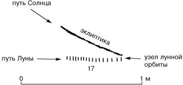 Запись драконического лунного месяца (см. рис. 16). Знаковый текст с теми же 27 элементами можно с тем же успехом использовать для счисления затменного (драконического) месяца. Продолжительность его составляет 27,2122 сут. (за это время Луна, выйдя из одного узла своей орбиты, вновь возвращается в него же). Умение учитывать время по такому календарю позволяло контролировать важные в астрономии события – сутки прохода Луны через критические точки ее орбиты (через узлы – места пересечения пути ночного светила с эклиптикой) и, значит, предугадывать (рассчитывать?) время затмений лунного и солнечного.
