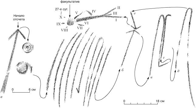 Считывание по знаковому тексту сидерического месяца рационально вести по 27 знакам, приняв за факультатив отсеченную голову антропоморфного существа. Порядок прохода по знакам представлен на рис. 16. Именно такой, а не иной ход счисления диктует характерная деталь записи – жесткое, в очевидной прямоте, противопоставление друг другу стрел б и е, расположенных в средней части композиции. В лобовой направленности их остриями друг к другу усматривается намек на порядок считывания знаков в правом отделе записи – стрела е как бы блокирует (препятствует!) продолжению счисления вверх и направляет его после стрелы б к 3-м расположенным правее знакам. Лишь после считывания дуг в, г и д, к счету подключалась стрела е (дуги г и в второй раз не считываются!). Но на сей раз противопоставленная снизу ей стрела б (то же самое блокирование!) вынуждает начать считывание знаков, размещенных левее (речь идет об отделах тела антропоморфного существа, о частях рук его и о штрихах, окаймляющих отсеченную голову своего рода “нимбом”). Так стрела б подсказывает, что счисление далее следует вести по весьма экзотическим счетным знакам – по частям тела антропоморфного существа и по штрихам “нимба”, а не по знакам, размещенным левее стрел и ниже фигуры человека. Без стрелы б едва ли можно было со спокойной уверенностью использовать при счислении столь необычные счетные элементы, как части тела человека.