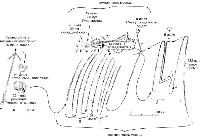 Запись синодического лунного месяца (рис. 12, а). Этот образный и знаково-числовой текст уникален в композициях Игнатиевского храма, ибо линейные элементы его составляют вместе “абстрактного” стиля фигуру мамонта и, следовательно, создают редкостную возможность уверенного истолкования этого гигантского животного в качестве образного (живого!) воплощения величайшего из мировоззренческих понятий древних жрецов и современных ученых – Времени (месяца и года). Всего знаков в записи – 30 и они таковы, что позволяют выбрать оптимальный вариант порядка считывания их. На рис. 12, а этот вариант представлен как схема отслеживания все того же лунного месяца – с 20 июня 1982 г. до 19 июля того же года (Астрономический календарь 1982, с. 25 и 27). Как видим, фазы определяют весьма характерные знаки: